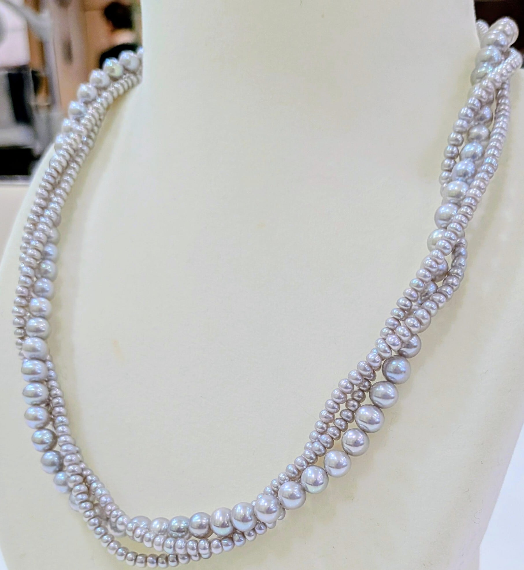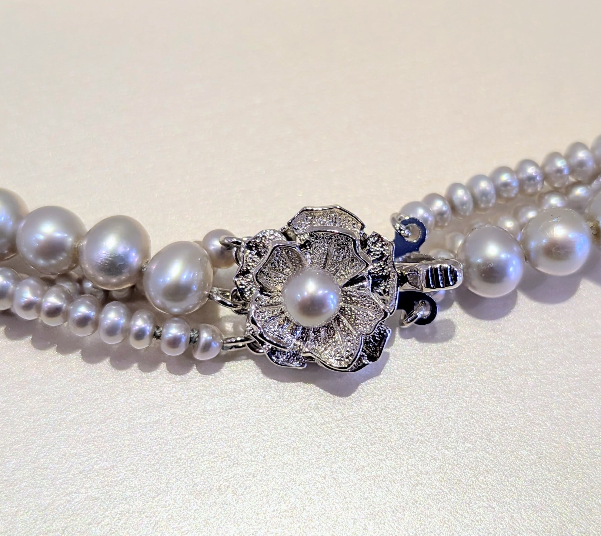 上品な淡水グレーパールを使用した3連ネックレスです。4ミリ珠の1連に加え、2ミリ珠の2連が並び、シンプルながらも洗練された印象を与えます。留め具は上品なフラワーモチーフになっております。