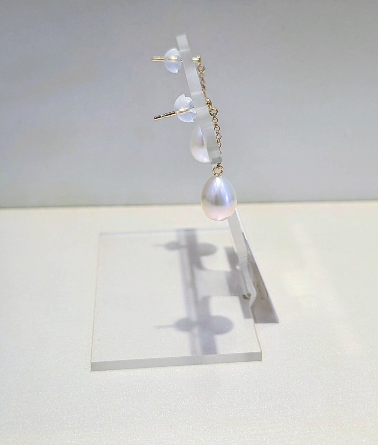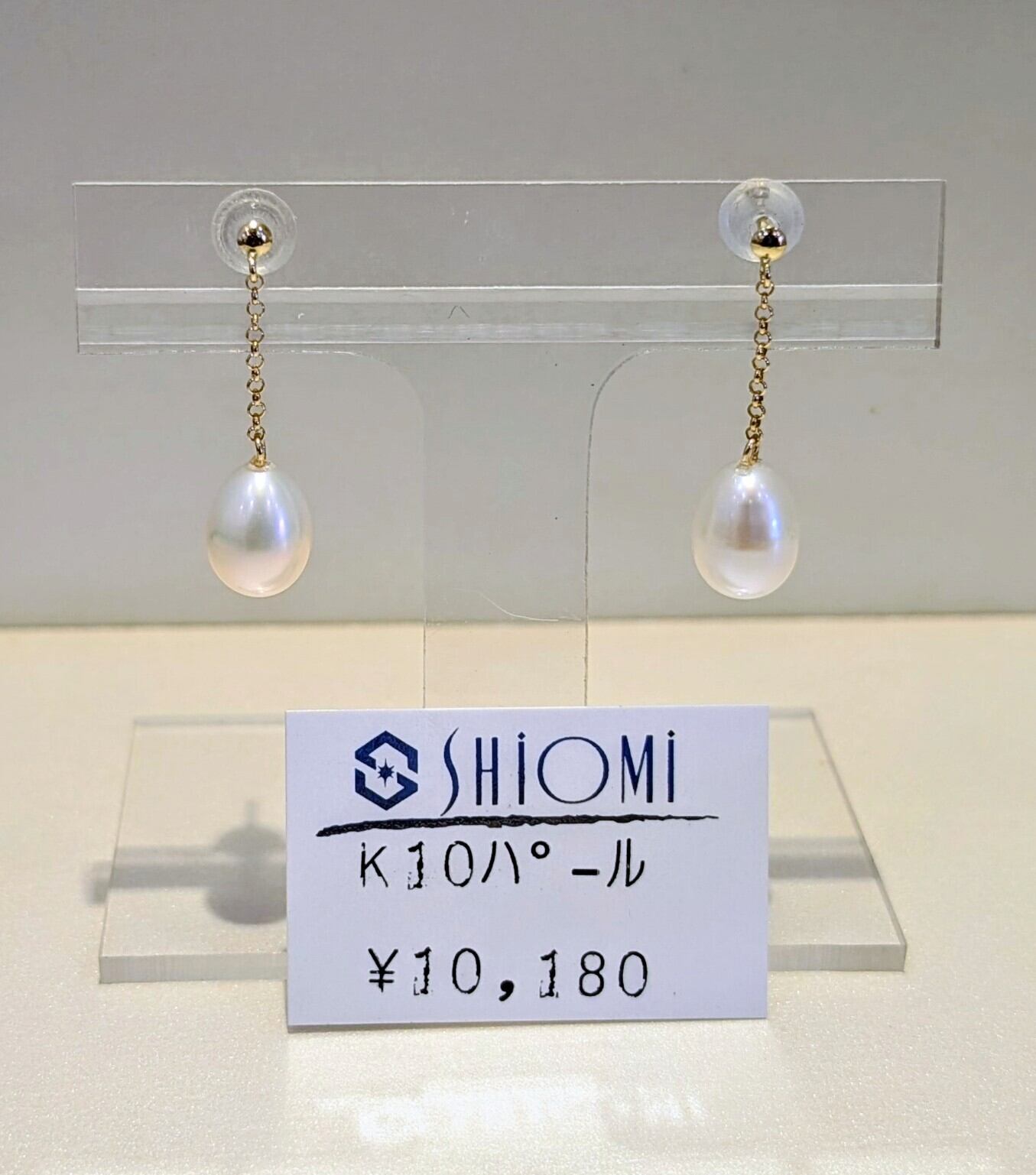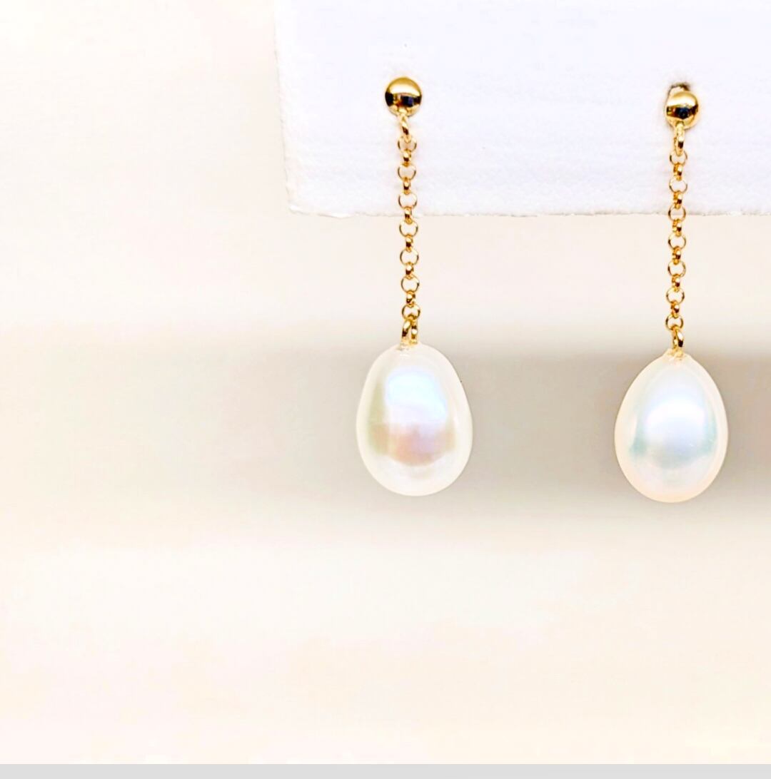 卵型の淡水パールが揺れるK10ジュエリーピアスです。淡水パールの柔らかな光沢が、耳元に上品な華やかさを添え、どんなスタイルにもマッチします。シンプルながらも存在感のある一品となっており、特別な日にも日常使いにも最適です。