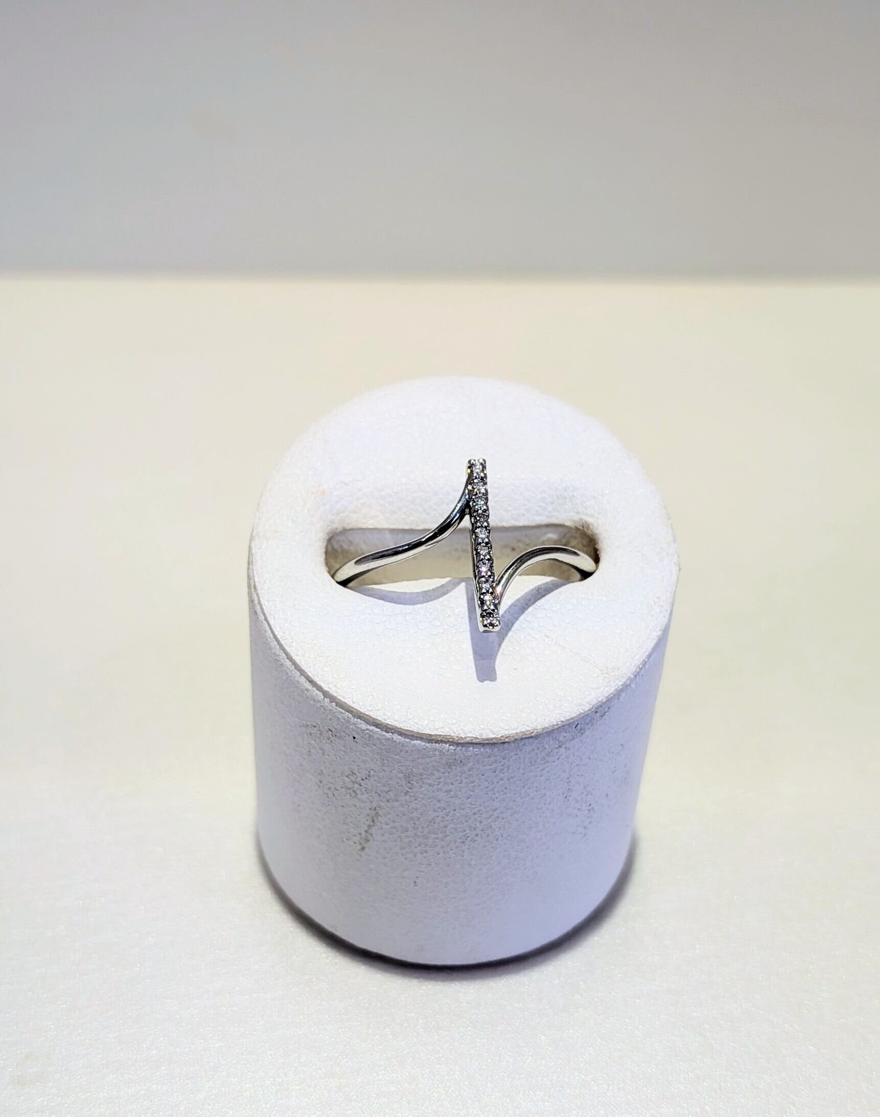 ユニークなラインを描くプラチナリングに、華やかさを添えるダイヤモンド0.05ctがセットされています。洗練されたデザインが、指先で輝くことで一層の上品さと存在感をもたらします。スッキリとした細ラインながらも独自の個性を引き立てます。特別な日から日常使いまで幅広くお楽しみいただけるアイテムです。